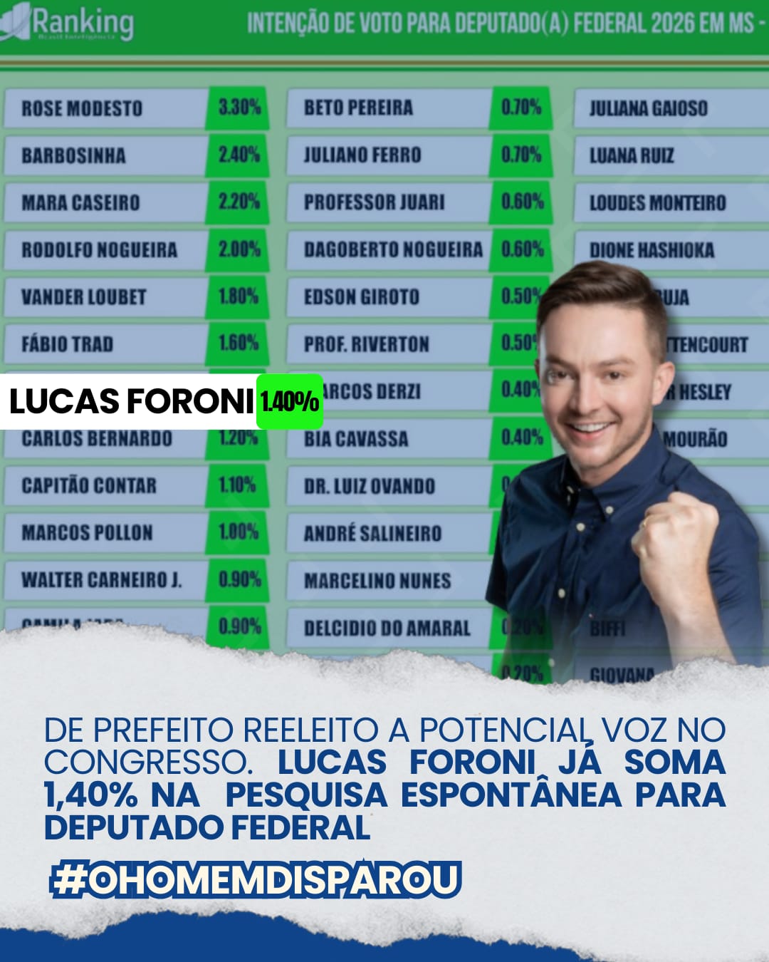 A pesquisa do Instituto Ranking Brasil Inteligência, realizada entre 1º e 6 de dezembro de 2025, mostrou que o eleitorado sul-mato-grossense está aberto a novas lideranças. Entre os nomes citados espontaneamente, o prefeito reeleito de Rio Brilhante, Lucas Foroni, ganhou destaque ao alcançar 1,40% das intenções de voto, superando figuras tradicionalmente presentes no debate estadual.
